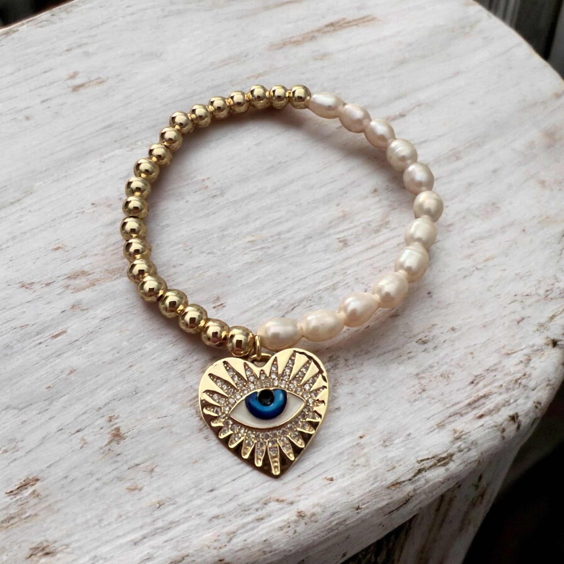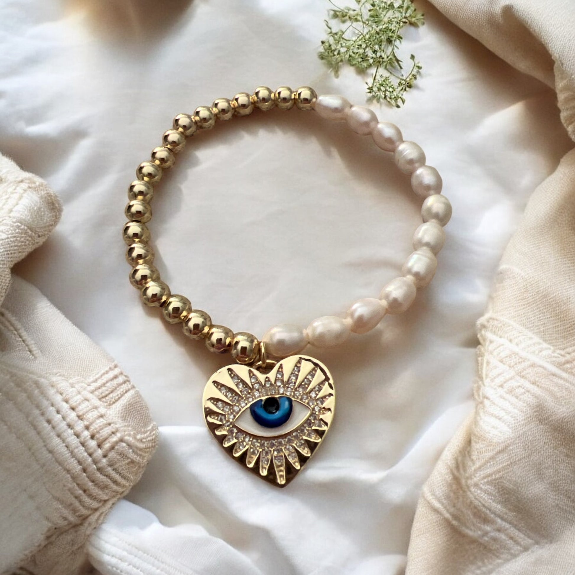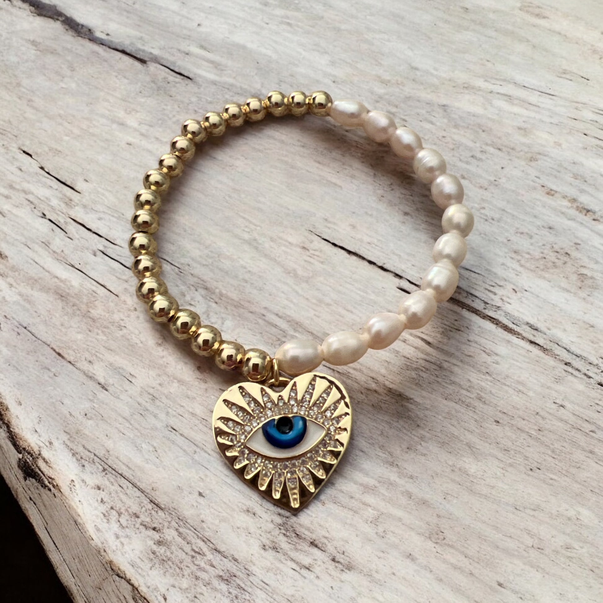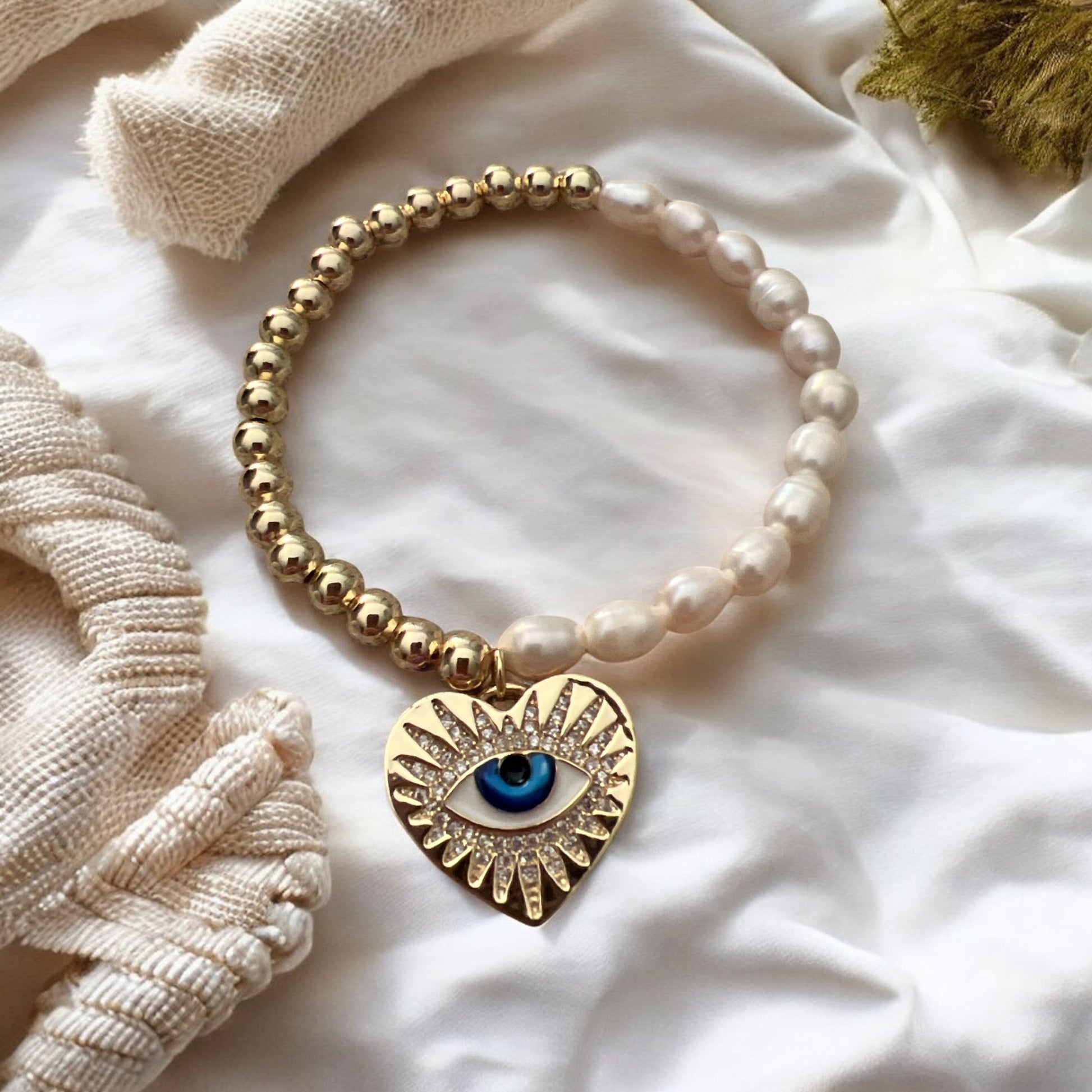 This elegant Evil Eye bracelet combines the traditional protection of the symbol with half gold and half pearl accents. Perfect for warding off negative energy and adding a touch of sophistication to any outfit.