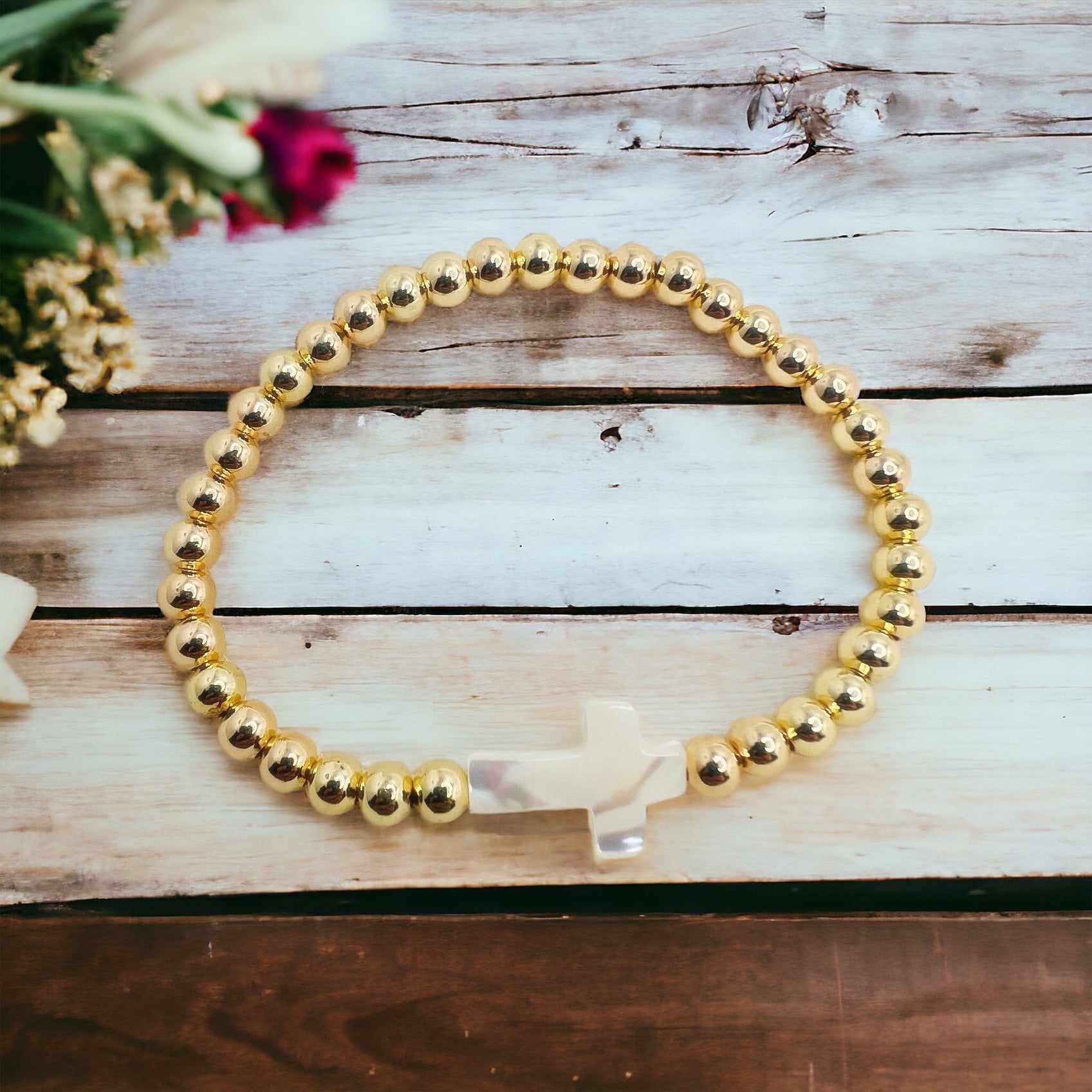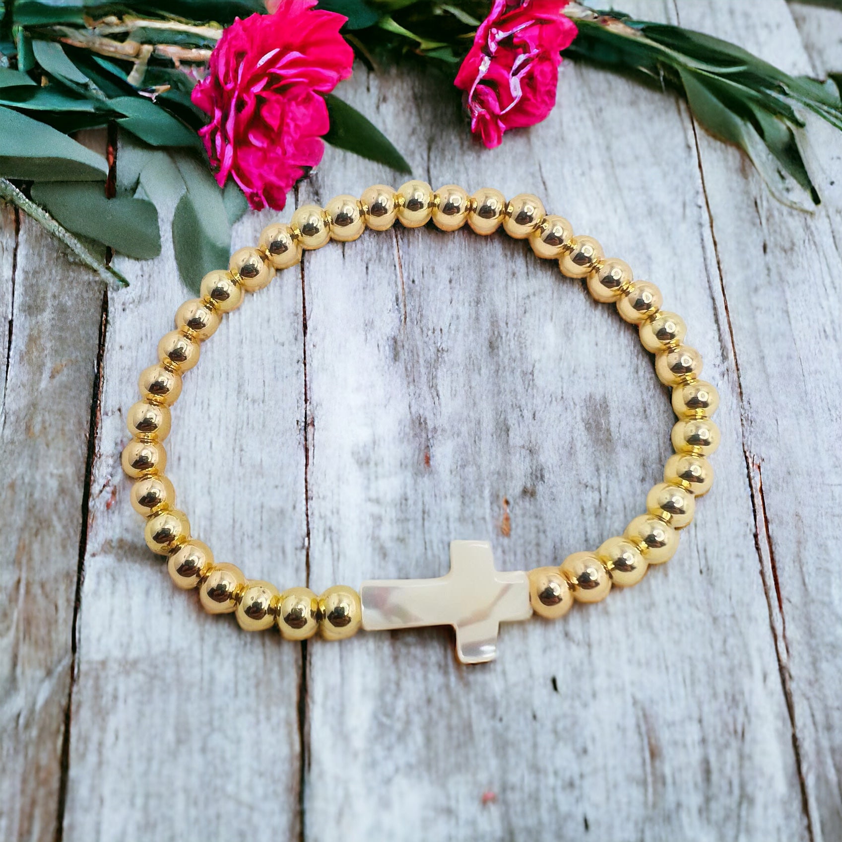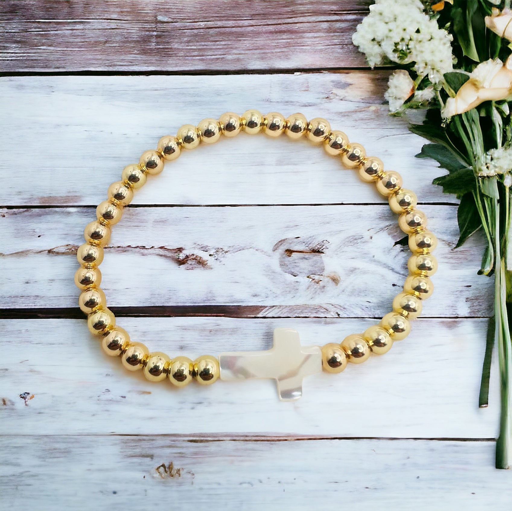 This elegant gold bracelet is adorned with a beautiful mother of pearl cross, adding a touch of sophistication to any outfit. The classic design and high-quality materials make it a timeless and versatile piece of jewelry. Elevate your style with this stylish and meaningful bracelet.