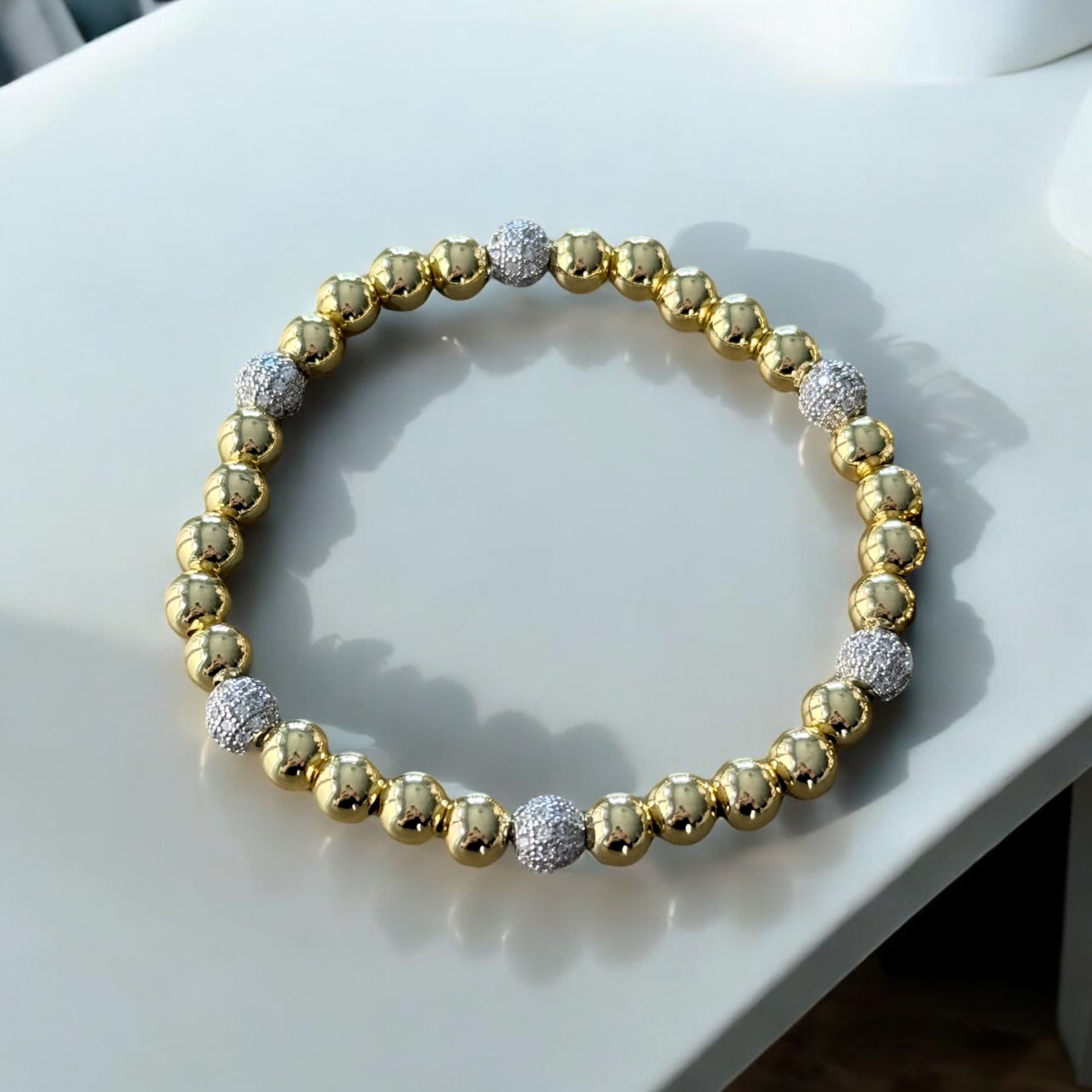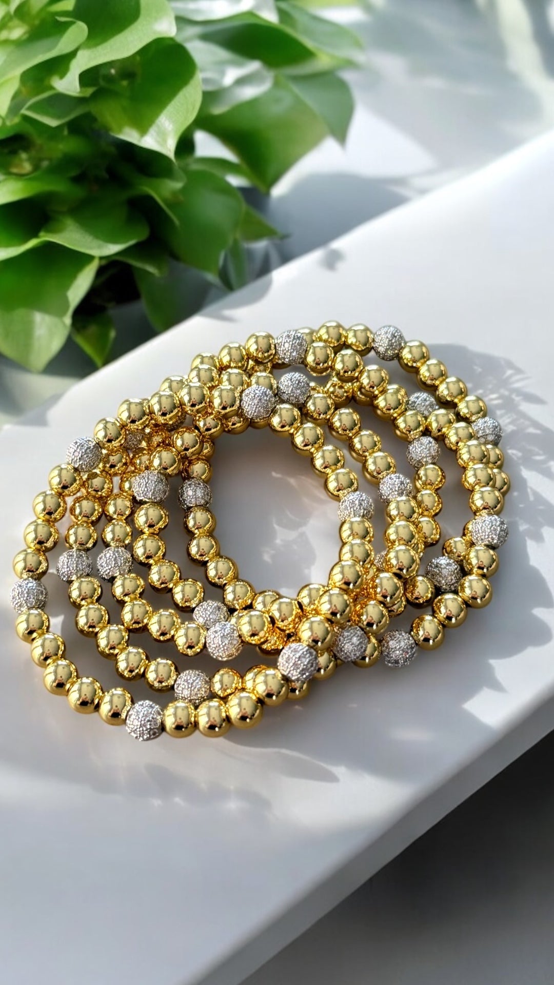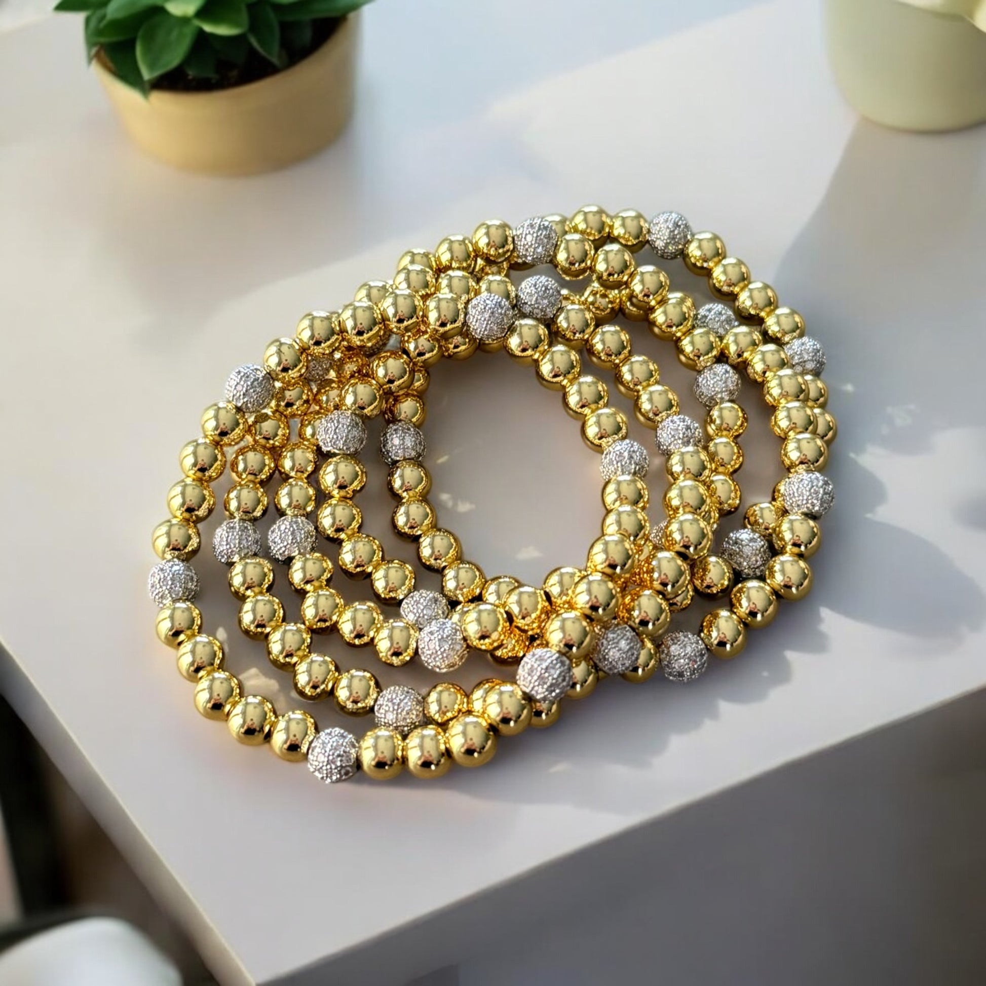 Gold bracelets with silver spacers.