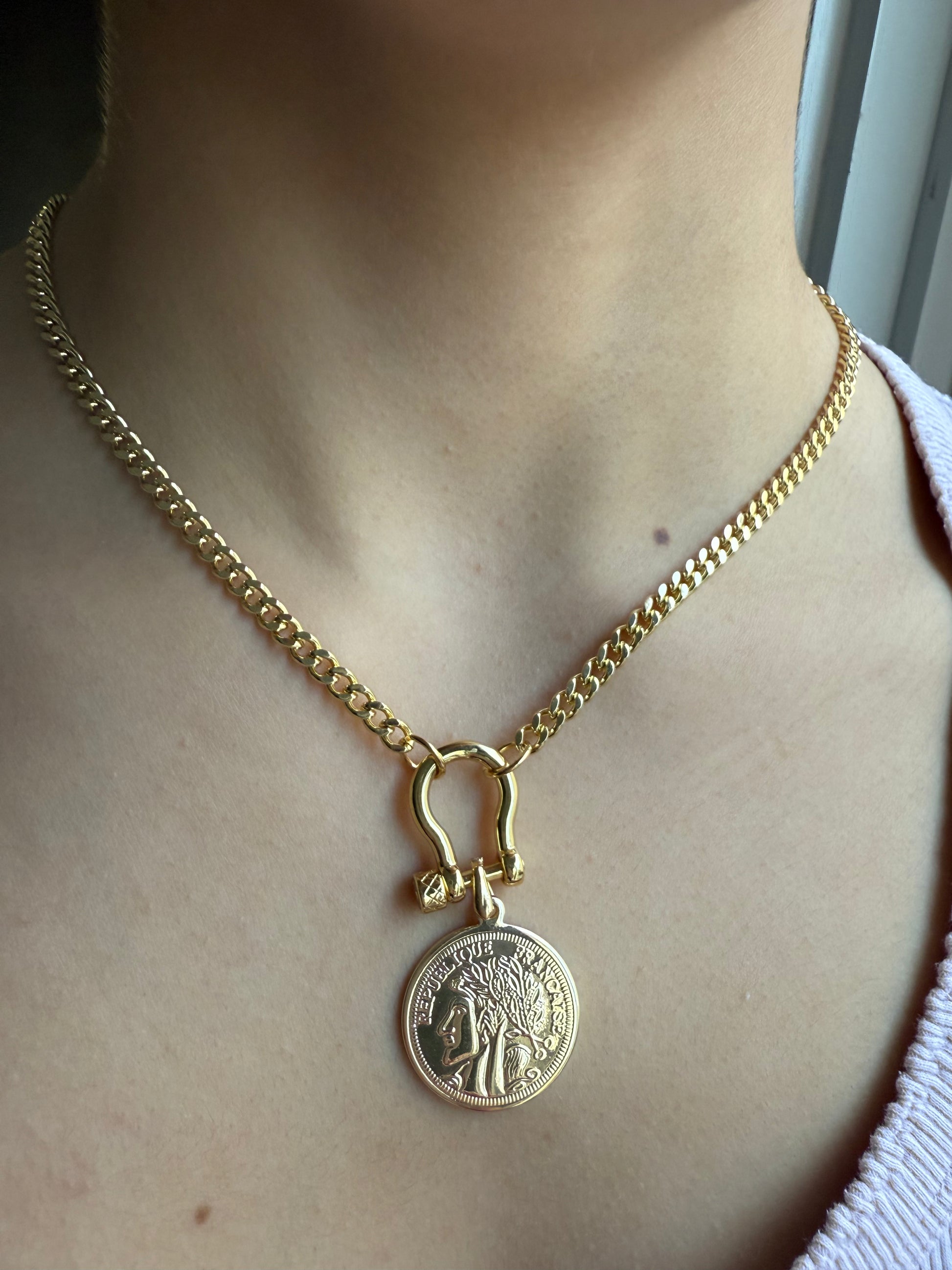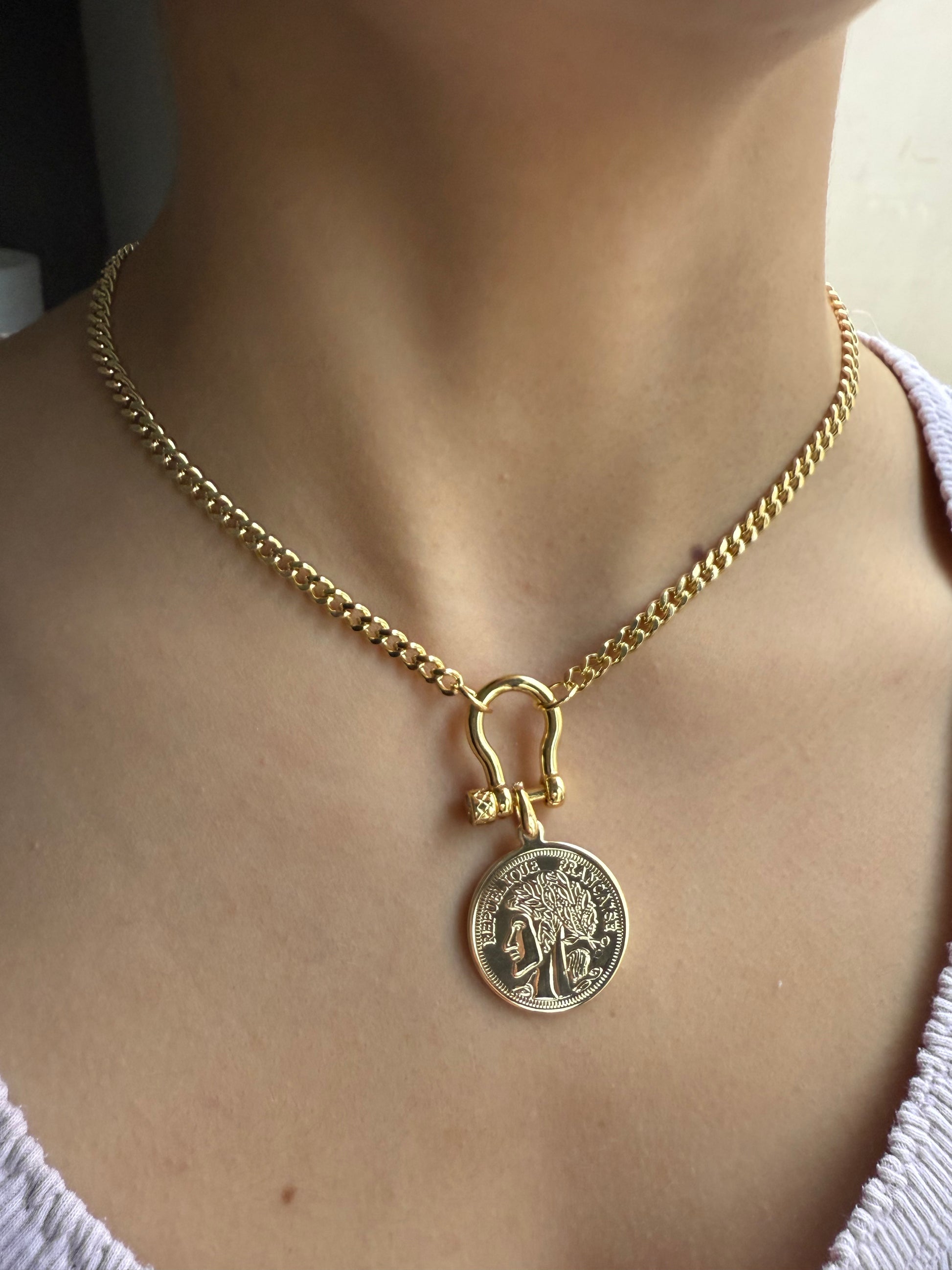 Make a bold yet elegant statement with this stunning gold-plated medallion necklace. Featuring a thick Cuban link chain and a unique clasp detail, the centerpiece is a beautifully engraved coin pendant .