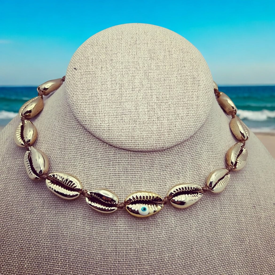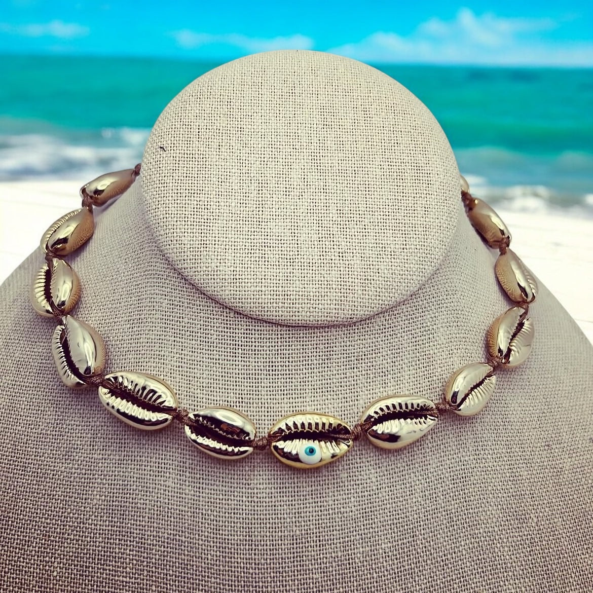 This stunning gold shell choker will add a touch of beachy elegance to any outfit. Made with a natural shell pendant, this necklace brings a unique and timeless beauty to your accessory collection. Let the ocean inspire your style with this one-of-a-kind piece.