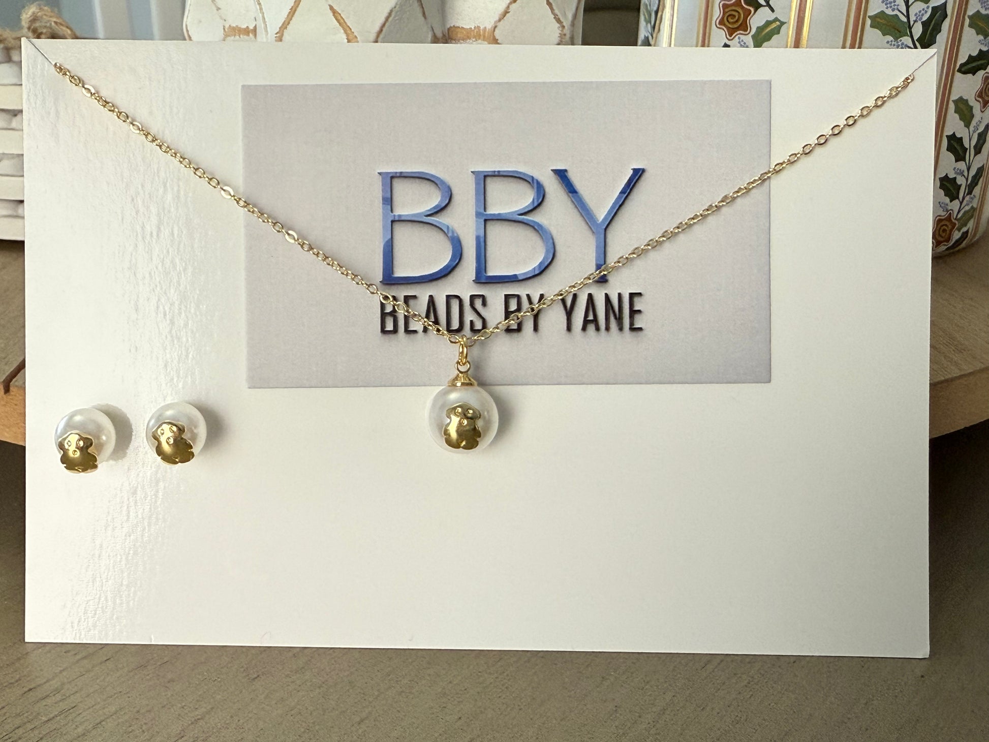 Gold Teddy Bear Pearl Necklace & Earrings Set