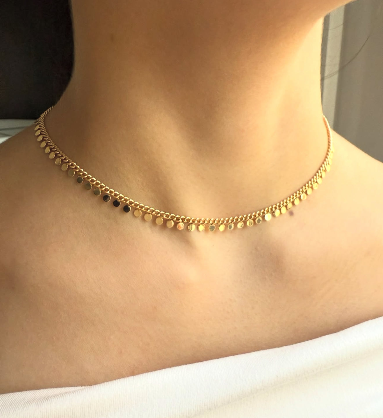 A timeless gold-plated choker adorned with delicate, dangling discs that shimmer with every movement. Lightweight and versatile, it’s perfect for layering or wearing solo to add a touch of effortless elegance to any look.