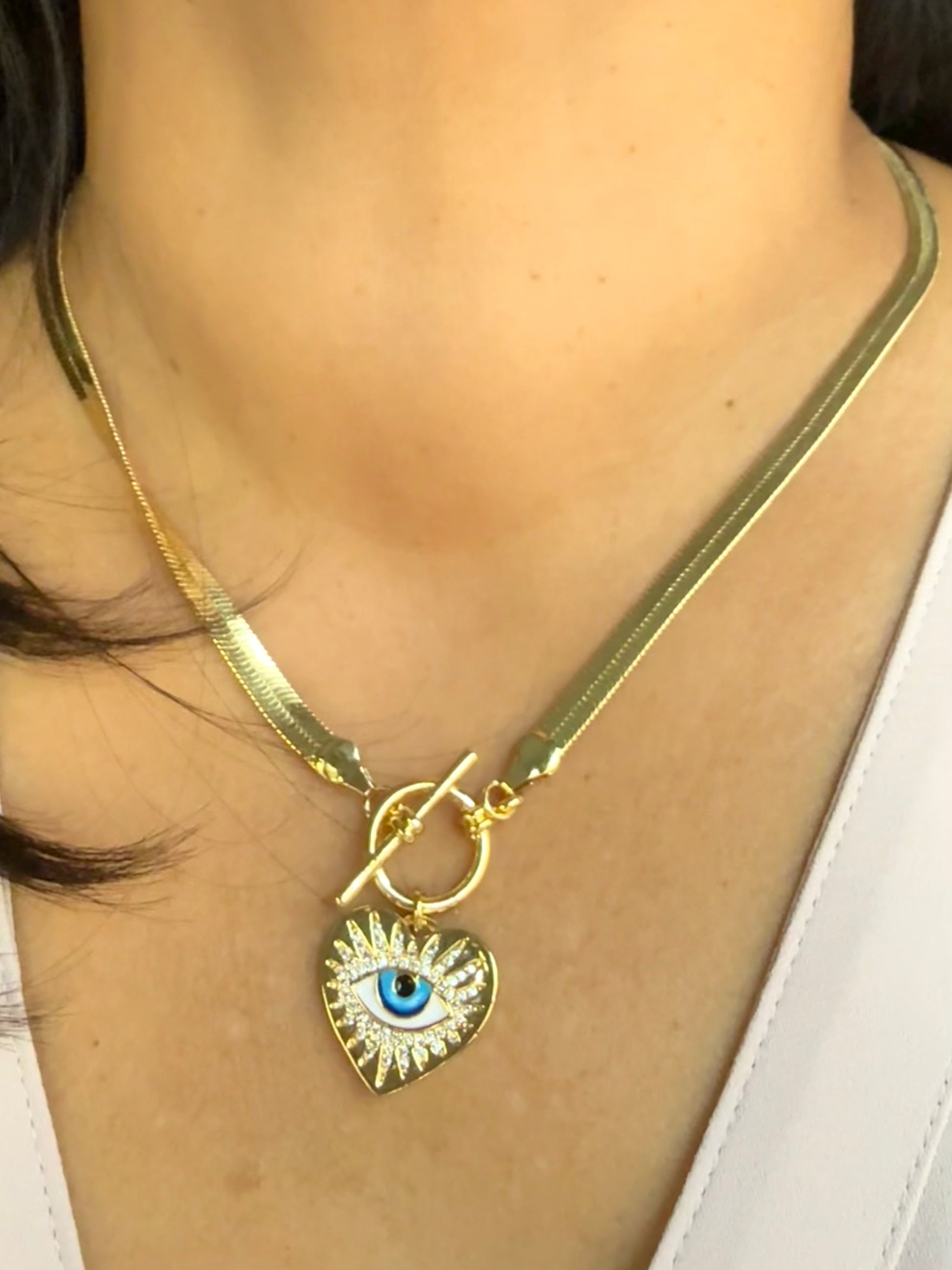 Make a bold statement with our Golden Heart Evil Eye Necklace, featuring a sleek gold herringbone chain and a heart-shaped pendant adorned with sparkling cubic zirconia. At its center, a striking blue evil eye offers both style and protection, making it the perfect piece to elevate any outfit while keeping bad vibes away.