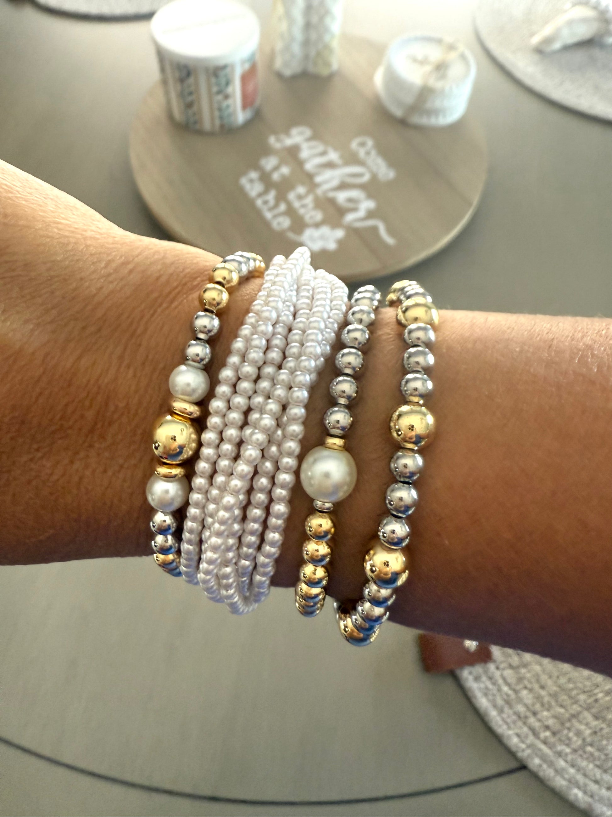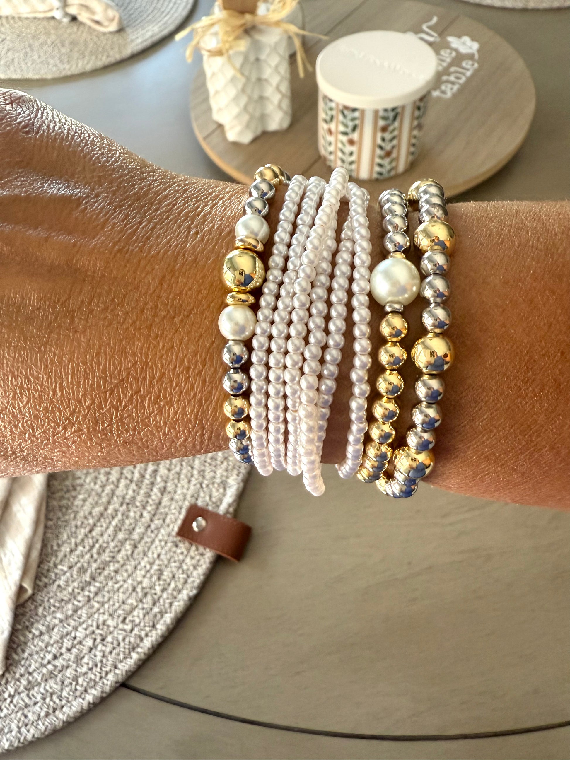 Elevate your style with this stunning bracelet stack featuring a mix of luminous pearls, gold-plated beads, and silver accents. Designed to layer effortlessly, this versatile set adds a touch of elegance and shine to any look—perfect for both everyday wear and special occasions.