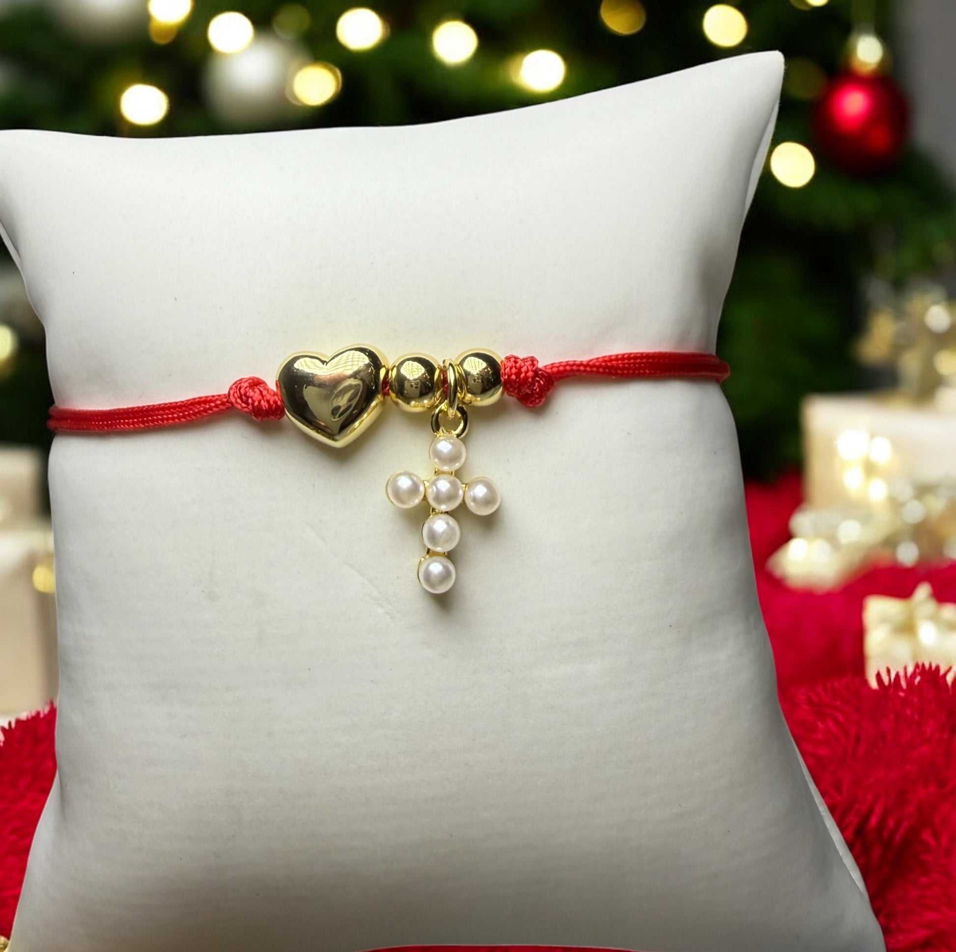 A beautiful red-string bracelet featuring a gold heart charm and a delicate pearl cross pendant. Designed as a symbol of love, faith, and protection, this piece is perfect for everyday wear or gifting during the holiday season. Adjustable fit and lightweight—your new favorite meaningful accessory.