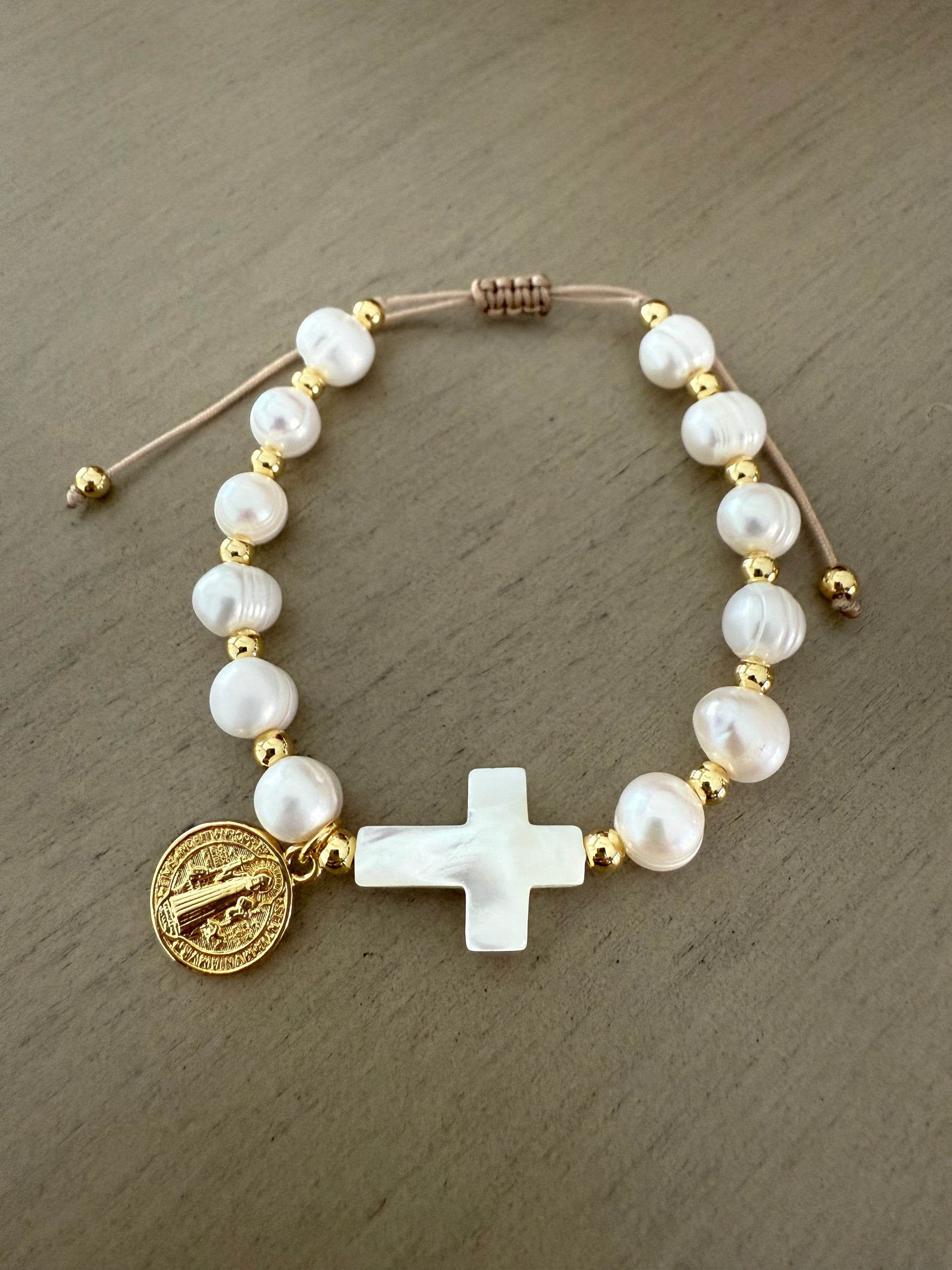 A beautifully handcrafted bracelet featuring lustrous freshwater pearls with gold-tone accents. Designed with a mother-of-pearl cross and a Saint Benedict medallion for protection and blessing. Adjustable, elegant, and perfect for everyday wear or as a meaningful gift.