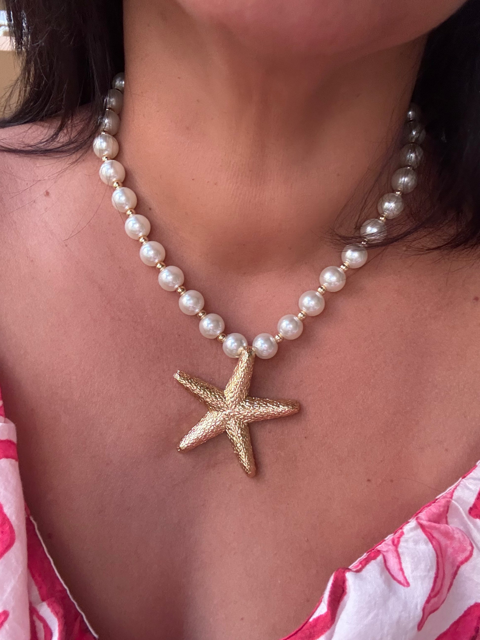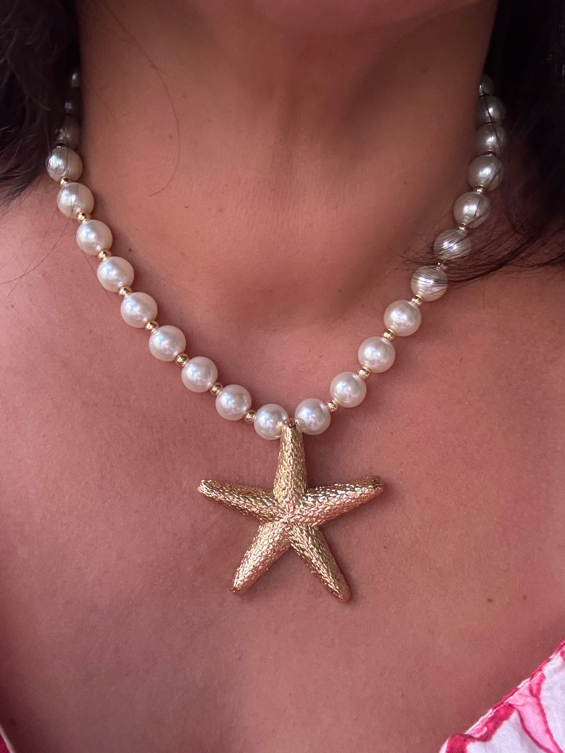 Turn heads with this stunning pearl necklace featuring a bold gold starfish pendant. Made with carefully selected materials for lasting shine, this beach-chic piece blends elegance and island vibes—perfect for vacations or standout everyday style.