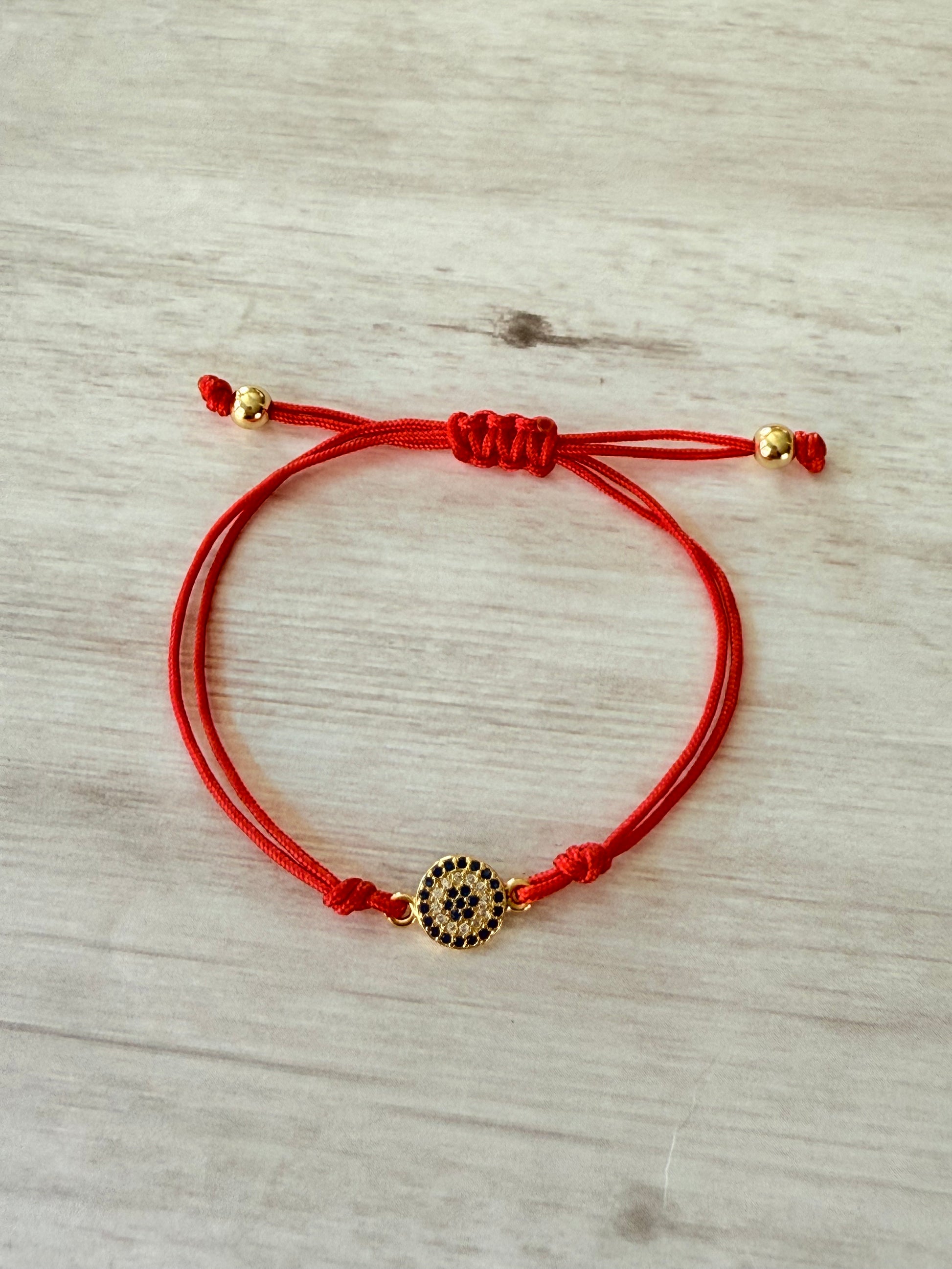This red cord gold evil eye is a stylish and protective accessory that features a traditional evil eye design on a vibrant red cord. Made from quality materials, it not only adds a pop of color to any outfit, but also wards off negativity and brings good luck. Enhance your style while staying protected with this must-have accessory.