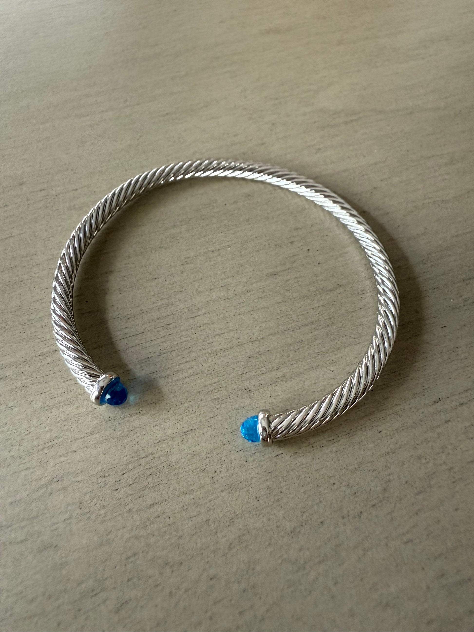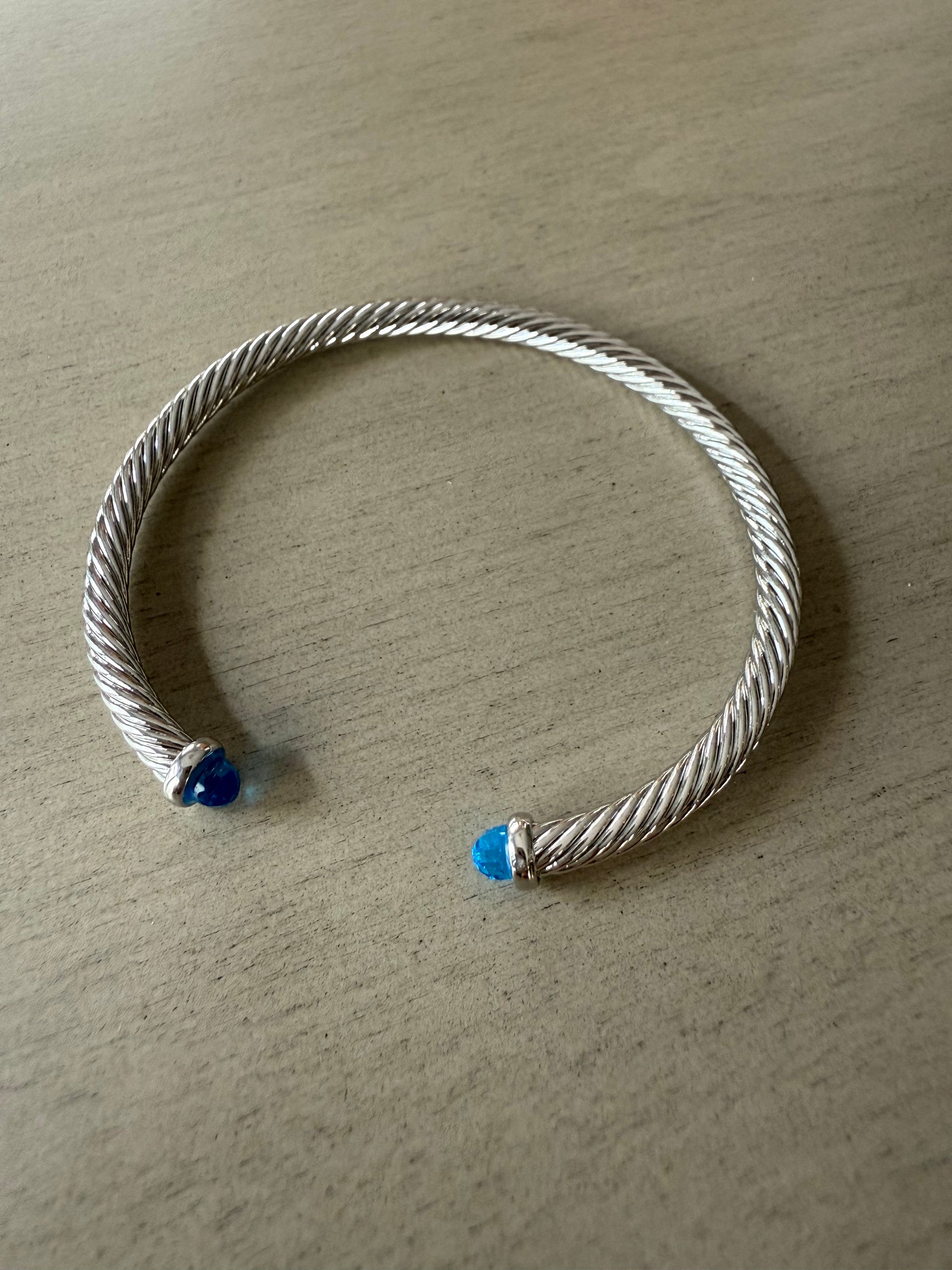 This silver twist cable cuff bracelet features a sleek and modern design with blue tips, adding a pop of color to any outfit. Made with high-quality silver cable, this cuff is both durable and stylish. Elevate your look with this versatile piece of jewelry.