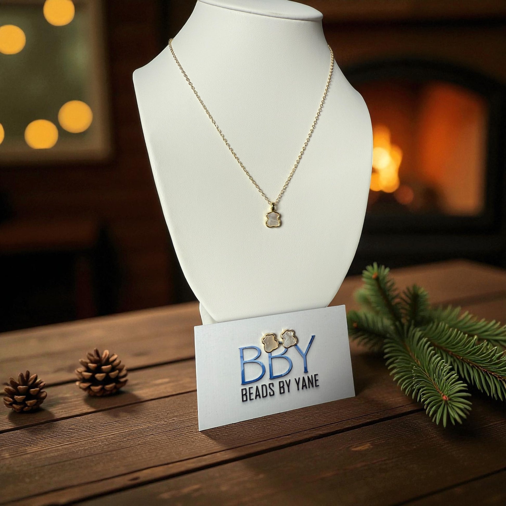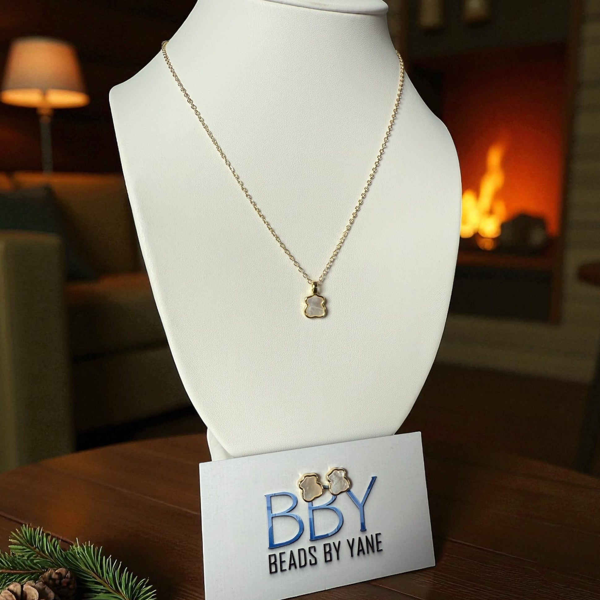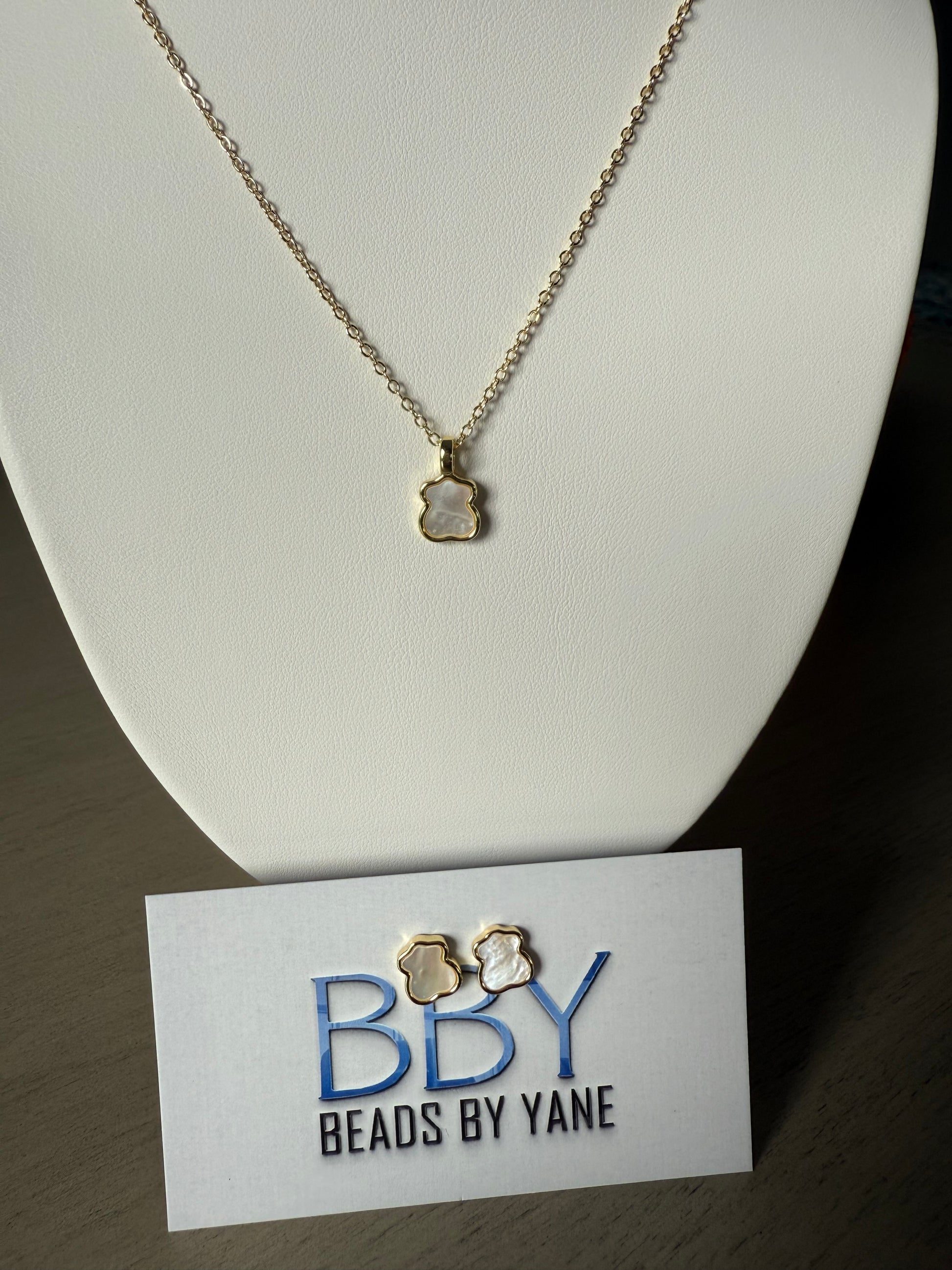Adorn yourself with the playful elegance of our Teddy bear jewelry set! This set includes a necklace and earrings, both crafted with mother of pearl and gold, for a luxurious and whimsical touch to any outfit. Perfect for any teddy bear lover or anyone looking to add charm to their wardrobe.